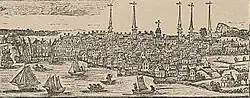 New Haven was one of the first planned cities in the U.S.[5][6][7] A year after its founding by English Puritans in 1638, eight streets were laid out in a four-by-four grid, creating the "Nine Square Plan".[8] The central common block is the New Haven Green, a 16-acre (6 ha) square at the center of Downtown New Haven. The Green is now a National Historic Landmark, and the "Nine Square Plan" is recognized by the American Planning Association as a National Planning Landmark.[9][10]
