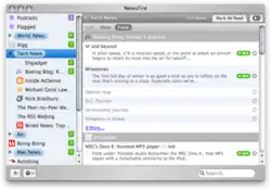 NewsFire is an RSS newsreader developed by David Watanabe for Mac OS X. It supports Atom, RSS, and Podcasting. NewsFire features groups, labels, smart groups, search, and integration with iTunes, Spotlight, and weblog editors. NewsFire can also import and export a blogroll from and to OPML; however, it cannot import Google Reader OPML at this time due to a known bug.