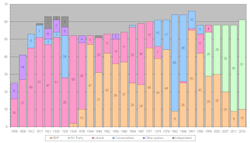 The charts on the right show the information graphically, with more recent elections on the right. They shows the popularity of the Liberal Party (red) before the Second World War and the subsequent rise of the Co-operative Commonwealth Federation, which was succeeded by the New Democratic Party (orange). The successes and failures of the Progressive Conservatives (blue) and the recent arrival of the Saskatchewan Party (green) as a new conservative party can also be seen.