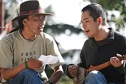 ![]() Ngawang Choephel (right) and a friend, prepare a traditional song for 'Tibet in Song.' | |