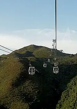 Ngong Ping Cable Car is a 5.7-kilometre (3.5 mi) long bi-cable gondola lift system (referred to by its operators as a "cable car") linking between Tung Chung (where it connects the MTR Tung Chung station) and Ngong Ping (where the Po Lin Monastery and Tian Tan Buddha are located).[21] Between the two terminals at Tung Chung (Tung Chung Terminal) and Ngong Ping, the lift system runs across the southern shore of the Hong Kong International Airport island and Nei Lak Shan, with eight towers including the stations. Five of the towers are located within the country park.