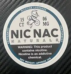 Nic Nac Naturals produces nicotine lozenges in mint and fruit flavors.[1] The dosages are 3-milligram and 6-milligram nicotine strengths and are made using non-tobacco (synthetic) nicotine. It also uses xylitol and essential oils for flavoring.[1] Magnotto and others describe the lozenges as a cleaner way to consume nicotine, free from artificial sweeteners, fillers, and harsh pH adjusters.[2][1]