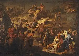 At least two of his academies (nude studies from life) are preserved, a drawing of a male nude at the Bibliothèque Municipale, Rouen, and a drawing of a bearded figure kneeling over a fallen warrior (perhaps Menelaus and Patroclus) which is known from two different engravings, one by Nicolas' brother, Jean-Baptiste, and the other by Johann Conrad Reiff.[21] Le Comte wrote of Jean-Baptiste, "to convey the strength of his brother's paintings, no other engraver will do."[4]
