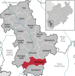 Düren (district)North Rhine-WestphaliaRhein-Erft-KreisEuskirchen (district)Rhein-Kreis NeussHeinsberg (district)AachenAachen (district)BelgiumHeimbachKreuzauNideggenVettweißDürenJülichLangerweheTitzMerzenichAldenhovenHürtgenwaldNörvenichIndenNiederzierLinnich