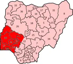 The Yoruba people are said to be one of the three largest ethnic groups in Nigeria, alongside the Igbo and the Hausa-Fulani peoples. They are concentrated in the southwestern section of Nigeria, much smaller and scattered groups of Yoruba people live in Benin and northern Togo and they are numbered to be more than 20 million at the turn of the 21st century.[48] The Yoruba people have always shared a common language called the Yoruba language and have had the same culture for hundreds of years now, but historically they were less likely to be a single political unit prior to the colonial period.[49] The Yoruba people are believed to have migrated from the east to their present lands west of the lower Niger River more than a millennium ago.[50] They eventually became the most urbanized Africans of precolonial times. The Yoruba people eventually formed many kingdoms of various sizes, each of which was centered on a capital city or town and was ruled by a hereditary king known as an Oba. Their towns eventually became more and more populated and grew into the present-day cities of Oyo, Ile-Ife, Ilesha, Ibadan, Ilorin, Ijebu-Ode, Ikere-Ekiti, and others.[51] Oyo developed in the medieval and early modern periods into the largest of the Yoruba kingdoms, while Ile-Ife still remained a town of very strong religious significance as the site of the earth's creation according to Yoruba mythology.[52] Oyo and the other kingdoms declined in the late 18th and 19th centuries owing to disputes among minor Yoruba rulers and invasions by the Fon of Dahomey (now Benin Republic) and the Muslim Fulani. The traditional Yoruba kingships still survive, but with only a hint of their former political power. These monarchs have titled individuals that serve beneath them, with most of this latter group making up the membership of the Ogboni secret society. Their traditional religion, Ifa, has been recognized by UNESCO as a masterpiece of the oral tradition of Humanity.[53]