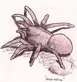 The Nīhoa trapdoor spider (Nihoa mahina) is a species of trapdoor spider in the family of Barychelidae that occurs on the island of Nīhoa, Hawaii in the northwestern area of the Hawaiian island chain. Its scientific name can be broken up into two parts, Nihoa which is not only its place of origin but the name of its genus, and mahina, which means 'moon' in the Hawaiian language. This could tie back to the fact that the species was discovered not only in the moonlight but also has fine silver hair, resembling its namesake. The species can also be distinguished by a pattern found on its dorsal and the absence of a second row of teeth. Burrows of trapdoor spiders can commonly be found by mangrove roots or near loose coral rubble. Before the 1980s, trapdoor spiders were not thought to exist in Hawaii. Upon their discovery, the genus was given the name Nihoa, because it was assumed not to exist elsewhere.[2]