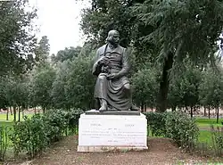 The first Gogol monument in Moscow, a Symbolist statue on Arbat Square, represented the sculptor Nikolay Andreyev's idea of Gogol rather than the real man.[30] Unveiled in 1909, the statue received praise from Ilya Repin and from Leo Tolstoy as an outstanding projection of Gogol's tortured personality. Everything changed after the October Revolution. Joseph Stalin did not like the statue, and it was replaced by a more orthodox Socialist Realist monument in 1952.[31] It took enormous efforts to save Andreyev's original work from destruction; as of 2014 it stood in front of the house where Gogol died.[32]