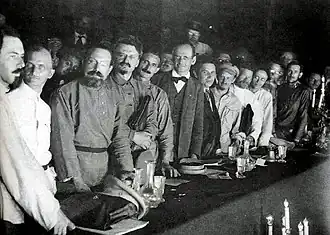 - ^ Rabinowitch, Alexander (2007). The Bolsheviks in power: the first year of Soviet rule in Petrograd. Bloomington: Indiana University Press, pp. 167, 174–175, 194 and passim. ISBN 978-0-253-34943-9. At the crucial meeting of the CEC convened at 3:00 am, on 24 February 1918, few hours before the German ultimatum was due to expire, Bukharin had the courage to break ranks and voted against accepting the treaty, while many other Left Communists either observed party discipline (V. Volodarsky and Stanislav Kosior, for instance) or were simply "no shows" (Dzerzhinsky, Kollontai, Uritsky, etc.) (p. 178).