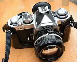 The Nikon FM3A is an interchangeable-lens, focal-plane shutter, 35 mm film, single-lens reflex (SLR) camera. It was manufactured by Nikon Corporation in Japan, on small-volume assembly lines, from 2001 to 2006. The camera was available in two colours: all black and satin chrome. The introductory US list price for the chrome body only (no lens) was $820.