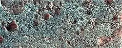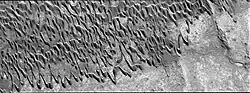 Nili Patera is a dune field on Mars. It is located on top of a lava bed, at the site of an ancient volcano, the Nili Patera caldera of Syrtis Major, near the Martian equator,[1] and it is one of the most active dune fields of Mars. Its location coordinates on Mars are 8.7° N latitude, 67.3° E longitude.[2] It is being actively studied by the HiRISE camera, on board the Mars Reconnaissance Orbiter, at the rate of one image every six weeks. The study of the movement of the dunes provides information regarding wind variation as a function of time and furthers the study of surface erosion characteristics of the Martian landscape. This information can then be used for the development and design of future Mars expeditions.[1][3] The dunes of the Patera field are of the barchan type and their study by HiRISE was the first one to establish dune and ripple movement of a minimum of 1 metre (3 ft 3 in) on Mars.[4] The Patera dune field, was also the first to be investigated using the COSI-Corr software, which was originally developed to analyse the movement of earthbound dunes.[4] The research results from the evidence provided by the monitoring of the Nili Patera field, indicate sand fluxes of the order of several cubic metres per metre per year, similar to the flux observed at the sand dunes of Victoria Valley in Antarctica.[5]