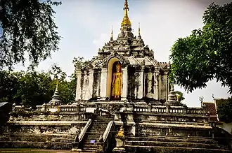 Nirat Hariphunchai (Thai: โคลงนิราศหริภุญชัย, Khlong nirat hariphunchai) is an old poem of around 720 lines, originally composed in Northern Thai language. Nirat, derived from a Sanskrit word meaning “without”, is a genre of Thai poetry that involves travel and love-longing for a separated beloved.[1] Hariphunchai (Pali: Haribhuñjaya) was an ancient kingdom, centered at Lamphun, incorporated into the Lan Na kingdom by Mangrai in the late 13th century. The poem recounts a journey from Chiang Mai to Lamphun to venerate the Buddhist reliquary, Wat Phra That Hariphunchai, with visits to around twenty temples and shrines along the way. During the journey, the author laments his separation from his beloved Si Thip. The journey takes two or three days. The poem ends at a festival in the reliquary, attended by a queen and her son. The original may date to 1517/18 CE. The poem was little appreciated until recently owing to the difficulty of the old language.