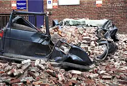 Although there were no directly related deaths, local news outlets reported that there was one death from a heart attack.[8] About 400 people were injured.[8] Most of the property damage occurred very near the epicenter or in unreinforced concrete or masonry buildings, such as those in the First Hill, Pioneer Square, and SoDo neighborhoods of Seattle. The Trinity Parish Church on First Hill was severely damaged.[9] The air traffic control tower at Seattle–Tacoma International Airport was heavily damaged; it has since been replaced with a more earthquake-resistant tower. The quake splintered a buttress under the dome of the capitol building in Olympia, but previous earthquake-resistance work prevented more serious harm to the building.[10] Additionally, power outages affected downtown Seattle.[11] The U.S. Military's Ft. Lewis and McChord Air Force Base received damage and there was very slight damage in Victoria, British Columbia.[12]