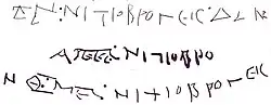 They are mentioned as Nitiobroges (var. nitiobriges, iciobriges), Nitiobrogum and Nitiobrogibus (var. nit[h]iobrigibus, nithiobrogibus) by Caesar (mid-1st c. BC),[1] Nitiobroges (var. antobroges) by Pliny (1st c. AD),[2] Nitióbriges (Νιτιόβριγες) by Ptolemy (2nd c. AD),[3] and as Nisiobroges by Sidonius Apollinaris (5th c. AD).[4][5] The name is also attested as Nitiobrogeis (νιτιοβρογεις) on an inscription written on a torc with the Greek alphabet, found in Mailly-le-Camp and dated to the mid-1st century BC.[6]