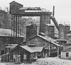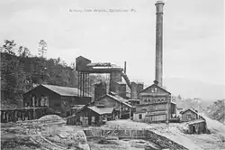 The preliminaries to the furnace's construction began in 1885, when Valentine and Thomas, an old ironmaking firm of Bellefonte, decided to sell off its properties. These then consisted of Bellefonte Forge, on Logan Branch just south of Bellefonte, and Bellefonte Furnace, a cold blast charcoal iron furnace lying about a mile south of the town, also on Logan Branch,[1] as well as holdings in local iron ore mines. Both plants were served by the Bellefonte, Nittany and Lemont Railroad, a subsidiary of the PRR. The ironworks and ore lands were bought on August 2, 1886, for $400,000, by the Valentine Ore Land Association,[2] whose principals organized the Centre Iron Company to erect a new iron furnace on the site of Bellefonte Furnace, which was to be torn down. A $600,000 mortgage was immediately raised on the properties, to supply the purchase money and funds for rebuilding the furnace.[2] The leaders of the company included Edmund Blanchard, W. M. Stewart, and B. K. Jamison, a Philadelphia banker.[3] The plant was built in 1887,[4] and the Nittany Valley Railroad was built to supply it with ore. It became necessary to raise additional funds, and in 1887, the Pennsylvania Railroad purchased $75,000 worth of bonds in exchange for exclusive rights to rail traffic to and from the furnace. The first load of ore was delivered by the Nittany Valley on February 28, 1888, and the furnace went into blast on March 4, 1888.[5] The company was originally headed by Jamison,[6] but by 1890, James B. Coryell was president and Jamison vice-president. At this time, the furnace had one 70-foot (21-meter) stack and three hot-blast stoves, with a capacity of 30,000 tons (27,200 tonnes) of iron per year. Ore was supplied from local hematite deposits, and the furnace was fuelled by Connellsville coke.[4] In the same year, however, the failure of Jamison's bank precipitated the closure of the furnace by the sheriff on November 15, 1890. It was subsequently sold under foreclosure.[7]