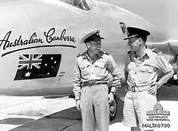 The flight received its first aircraft, the Canberra bomber A84-307, on 15 June 1953.[1] This aircraft had been built in Britain as the RAAF's first Canberra, and was flown to Australia by Wing Commander Cuming in August 1951. The journey had been completed in a flying time of 21 hours and 41 minutes, setting an unofficial record for the route.[5] The flight's second aircraft, A84-201, arrived on 1 July.[1] This was the first Australian-built Canberra and was assigned to No. 1 Long Range Flight shortly after being completed. The second Australian-built Canberra, A84-202, was also assigned to the flight in August.[5] All three aircraft were modified for their specialised role by No. 1 Aircraft Depot. These modifications included fitting distance-measuring equipment in each of the aircraft, and three fuel tanks in their bomb bays.[1][5] Wing Commander Cuming told journalists in August that the Australian-made Canberras were preferred to the British models on the grounds of national prestige, and because the aircraft were fitted with superior navigation equipment.[6] A84-307 was retained by the flight, however, as the reserve aircraft to be used if modifications to A84-202 were not completed in time for the race.[5]