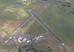 The airfield had a brief motor racing career, beginning on Australia Day in 1947 when it held its first motor race meeting. Racing returned in November of both 1950 and 1951, then finally for an International Formula Libre race, the 1961 Victorian Trophy, in February 1961, which was attended by some European Formula One teams. BRM factory drivers Dan Gurney and Graham Hill finished first and second in the major race, the Victoria Trophy, with Ron Flockhart third in a Cooper. Famously on the night before the race Gurney's car was stolen from its hangar and driven into or hidden with, hay bales out on the track with minimal damage.[5][6]