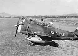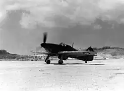 The squadron was reformed at RAF Habbaniya, Iraq on 12 July 1941 by re-numbering No. 127 Squadron and again was equipped with Gladiators and Hurricanes.[1] The main role was the defence of the oil ports, when fighting in Iraq ended the squadron sent detachments to Palestine and Cyprus. The squadron moved to Haifa, Palestine in January 1942. Re-equipped with the Hurricane IIB the squadron moved to the Far East in early 1942 to join the campaign in Burma. The first action was in February 1943 when the squadron flew ground attack sorties. It undertook escort duties to the Douglas Dakota operating supply missions. The squadron re-equipped with the P-47 Thunderbolt in 1944 and returned to action in September 1944 to join an attack on Rangoon. It fought to the end of the Burma campaign and it had moved to India to re-group ready to join the action in Malaya as the war ended. The squadron was disbanded on 26 September 1945 at RAF Tanjore, India.[2][5]
