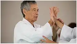 Nobuyoshi Tamura (田村 信喜, Tamura Nobuyoshi; 2 March 1933 in Osaka[1] – 9 July 2010)[2] was a prominent aikidoka and a direct student of Morihei Ueshiba. The son of a kendo teacher, Tamura entered the Aikikai Hombu Dojo in 1953[3] as an uchi-deshi (live-in student) of aikido founder Morihei Ueshiba. He was one of Ueshiba's favorite pupils and since 1964 has greatly contributed to the development of aikido in Europe and France in particular. He was the National Technical Director (DTN) of the FFAB (French Federation of Aikido and Budō). He held the rank of 8th dan and the title of Shihan. Throughout his teaching career he trained many others instructors in various countries around the world but foremost Western Europe.[2] In 1999, he received the medal of "Chevalier de l'ordre National du Mérite" from the French government. Tamura published several books on aikido in French. His dojo, Shumeikan Dojo, is located in the village of Bras, France. His former students include Jorge Rojo Gutierrez, Toshiro Suga, Pierre Chassang and Alain Peyrache.