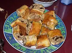 Nokul or lokul is a type of puff pastry from the Turkish cuisine. It is common in the Central Black Sea Region of Turkey and the Turkish-minority areas of Bulgaria with variations. Nokul is sometimes served hot as an appetizer instead of bread. It consists of a rolled sheet of yeast dough onto which feta-style white cheese, walnut or poppy seed is sprinkled over a thin coat of butter. The dough is then rolled, cut into individual portions, and baked.[1]