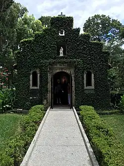 The devotion to Our Lady of La Leche was brought over from Spain in the late 1500s,[7] and the mission grounds served as the site of the Shrine of Our Lady of La Leche, the first Marian shrine in the United States.[1] The centerpiece of the shrine is a statue of the Virgin Mary nursing the infant Jesus, which is a replica of the Our Lady of La Leche statue placed in a cathedral in Spain by Phillip III.[8] The original chapel was destroyed in 1728 during the British siege of St. Augustine and was rebuilt in 1875 by Bishop Augustin Verot, though it later suffered damage from a hurricane.[9] The current ivy-covered chapel, which seats about 30 people, was built in 1914 and is a replica of previous chapels built of coquina.[7] The shrine is a popular religious pilgrimage site, with many visitors seeking blessings and intercessions for successful pregnancy and delivery.[8]
