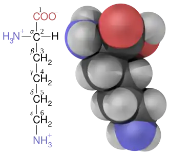 In addition to the IUPAC numbering system to differentiate the various carbons in an organic molecule, by sequentially assigning a number to each carbon, including those forming a carboxylic group, the carbons along the side-chain of amino acids can also be labelled with Greek letters, where the α-carbon is the central chiral carbon possessing a carboxyl group, a side chain and, in α-amino acids, an amino group – the carbon in carboxylic groups is not counted.[8] (Consequently, the IUPAC names of many non-proteinogenic α-amino acids start with 2-amino- and end in -ic acid.)