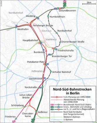 • A third section that exists in the thinking of the planners would see a new north–south connection from Potsdamer Platz via a new interchange station at Gleisdreieck (Berlin U-Bahn) and onwards towards Berlin Yorckstraße station (Großgörschenstraße), and interchange at Julius-Leber-Brücke station with the Wannseebahn. This section would use the exits at the southern end of the underground Potsdamer Platz station, originally built in 1935/36 for the Ringbahn trains to terminate underground at Potsdamer Platz instead of further south at the Ringbahn station next to the Potsdamer Bahnhof.