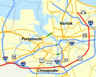 Military Highway effectively begins in Suffolk outside the Hampton Roads Executive Airport, picking up the designations of U.S. 13, U.S. 460, and U.S. 58 from Portsmouth Boulevard. It continues generally northeastward as West Military Highway, crossing under and interchanging in Bowers Hill with I-664 (which shortly thereafter splits in its own Y-interchange with I-264 and I-64). It also intersects in this same area with Airline Boulevard, to which it loses US 58. After this complex set of interchanges and intersections, it becomes South Military Highway and turns southeastward, paralleling I-64 before crossing under it 2 miles later. It then continues east through Chesapeake, intersecting George Washington Highway (US 17) and crosses the Southern Branch Elizabeth River on the Gilmerton Bridge.