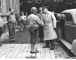 Major General Norman Cota greets General George C. Marshall, the U.S. Army Chief of Staff, on Marshall's arrival in Elsenborn, Belgium. October 22, 1944.