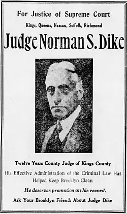 In 1920, he was elected to the New York Supreme Court, where he served until retirement in 1932, when he reached the age limit.[1] As a judge, Dike was known for his severity towards criminals and belief in punishment as a deterrent.[2] After retirement he became referee for the second Judicial District of the New York Supreme Court.[2]
