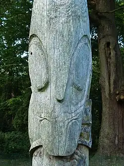 He carved The Story of Big Beaver totem pole, a 16.8-metre (55 ft) pole installed in 1982 at the entrance to the Field Museum of Natural History in Chicago.[3] In 1992, Tait raised a totem in Bushy Park in London, England. Tait raised a totem pole to commemorate the opening of the Nisga'a Lisims Government building in New Aiyansh, BC, "Goothl Lisims", which translates as "the heart of the Nass". He has also carved poles standing in Osaka, Japan, and Germany, as well as many private collections.
