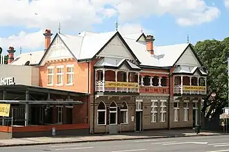 In 1872 the Burtons erected the first Normanby Hotel on the site, a modest two-storeyed building which fronted Kelvin Grove Road.[2][3] It is likely that the hotel was named after the recently appointed Queensland Governor George Phipps, 2nd Marquess of Normanby. In 1889, the licensee William Valentine (son-in-law of the Burtons) decided to demolish the hotel to make way for the newer larger hotel facing Musgrave Road.[1]