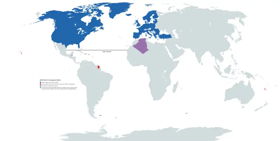It was the opinion in August 1965 of the US State Department, the US Defense Department, and the legal division of NATO that an attack on the North Pacific U.S. island state of Hawaii would not trigger the treaty, but an attack on the other 49 would.[65] The Aleutian Islands in the North Pacific are not treated in the same manner by NATO as Hawaii is, since they are politically part of Alaska rather than their own state like Hawaii.[66] The Spanish cities of Ceuta and Melilla on the North African shore are not under NATO protection in spite of Moroccan claims to them. Legal experts have interpreted that other articles could cover the Spanish North African cities but this take has not been tested in practice.[67] This is also why events such as the Balyun airstrikes did not trigger Article 5, as the Turkish troops that were attacked were in Syria, not Turkey.[68] As well as why the 1982 invasion of the Falkland Islands by Argentina did not trigger Article 5, as the Falkland Islands are in the South Atlantic, south of the Tropic of Cancer, and not within the geographic area covered by Article 6.