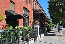 In November 1990, Glacier Park sold the 40-acre site to a Portland-based development company, Prendergast & Associates.[22] It was determined that extensive clean-up of contaminated soil from decades of industrial use would be needed before most redevelopment could proceed. Prendergast & Associates were predicting an approximately 20-year timeframe for redevelopment of the entire area of former railyards and associated buildings.[22] The two former-SP&S freighthouses were listed on the National Register of Historic Places in 1996, as the North Bank Depot Buildings. At that time, they were vacant and had not yet been renovated.[2] In the late 1990s, they were renovated and converted for residential use.[23]