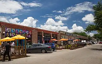 - Old brick commercial building with signage "Bishop Arts District" above several of the shops (2012)