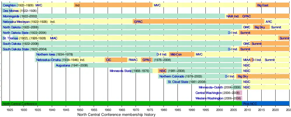 - In 1922, the North Central Conference (also known as the North Central Intercollegiate Conference) was founded with nine charter members: College of St. Thomas, Creighton University, Des Moines University, Morningside College, Nebraska Wesleyan University, North Dakota Agricultural College, University of North Dakota, South Dakota State College of Agricultural and Mechanical Arts, and the University of South Dakota. St. Thomas left after the 1922 season.