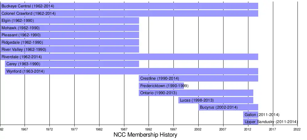 The league remained consistent until the 1990-91 school year when Elgin, Pleasant, Ridgedale and River Valley joined the newly formed Mid-Ohio Athletic Conference; Carey and Mohawk left for the Midland Athletic League; while Crestline, Fredericktown and Ontario joined the NCC. Lucas joined the NCC for the 1998-99 school year, while Fredericktown left for the Mid-Buckeye Conference in 1999-00. Bucyrus joined the NCC for the 2002-03 school year, bringing the NCC to an eight team format.