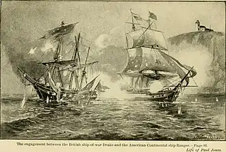 The North Channel Naval Duel was a single-ship action between the Continental Navy sloop of war Ranger (Captain John Paul Jones) and the Royal Navy sloop-of-war Drake (Captain George Burdon) on the evening of 24 April 1778. Fought in the North Channel, separating Ireland from Scotland, it was the first American naval success within Atlantic waters, and also one of the only American naval victories in the conflict achieved without an overwhelming superiority of force. The action was one of a series of actions by Jones that brought the war to British waters.