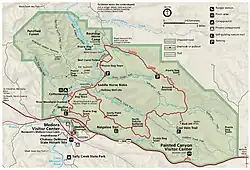 Both main units of the park have scenic drives, approximately 100 miles (160 km) of foot and horse trails, wildlife viewing, and back country hiking and camping. The park received 850,000 recreational visitors in 2021.[2]