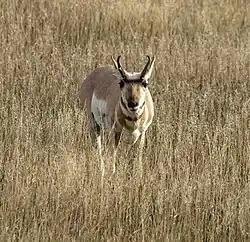 The park is home to a wide variety of Great Plains wildlife, including bison, coyotes, cougars, mustang horses, badgers, elk, bighorn sheep, white-tailed deer, mule deer, pronghorn, prairie dogs, and at least 186 species of birds including golden eagles, sharp-tailed grouse, and wild turkeys. Nine longhorn cattle roam the North Unit.[7]