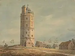 Towards the end of the 18th century the North Foreland Lighthouse underwent some considerable alterations and repairs. In 1792, under the supervision of John Yenn (Surveyor to Greenwich Hospital), two stories of brick were built on the original structure which raised it to the height of 100 feet including the lantern room at the top in which the lights were kept. (To prevent accidents from fire the lantern room was coated with copper as was also the gallery around it; this gallery used to be much frequented by the visitors to Margate on account of the extensive views.)[4] At the same time oil lamps were installed in the tower, together with a new optical system designed by Thomas Rogers (who had previously installed a similar system in the lower lighthouse at Portland): it consisted of two rows of nine lamps and reflectors arranged in a convex curve,[6] placed behind a row of solid glass convex lenses which were incorporated within the glazing around the lantern room.[5]