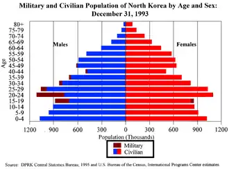 The figures disclosed by the government reveal an unusually low proportion of males to females: in 1980 and 1987, the male-to-female ratios were 86.2 to 100, and 84.2 to 100, respectively.[12] Low male-to-female ratios are usually the result of a war, but these figures were lower than the sex ratio of 88.3 males per 100 females recorded for 1953, the last year of the Korean War.[12] The male-to-female ratio would be expected to rise to a normal level with the passage of years, as happened between 1953 and 1970, when the figure was 95.1 males per 100 females.[12] After 1970, however, the ratio declined. Eberstadt and Banister suggest that before 1970 male and female population figures included the whole population, yielding ratios in the ninetieth percentile, but that after that time the male military population was excluded from population figures.[12]