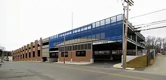 Beginning in 2007, the Montachusett Regional Transit Authority and Montachusett Regional Planning Commission began planning for an expansion of parking capacity. Construction began in March 2012 on a three-story garage which will provide 340 parking spaces.[11] The $7.7 million project, which was funded by the FTA through earmarks and formula funding, includes a covered busway and charging stations for electric cars.[8] Originally to be completed in August 2013, the garage was delayed due to high summer heat which prevented pouring concrete.[12] The garage was dedicated on November 1, 2013, but it was not yet completed.[13] After five months of delays caused by the contractor's financial problems, the garage opened on May 20, 2014.[14][15][16]