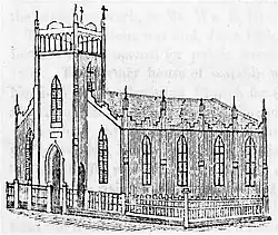 The church was Romanesque in style, of bluestone, 91 by 66 feet, with a tower projection of four feet (making the depth 95 feet). It had a slate roof with eaves 41 feet, and a ridge 62 feet, above the pavement, and a central wooden spire 182 feet high. The interior was finished in fresco and furnished with an organ from Jardine and Son. There were 152 pews on the main floor and 60 in the two side galleries with a disconnected organ gallery in front. The house was lighted at night from the ceiling. The capacity was 1,000 and the total cost, with the organ and other furniture, was $45,759.28.[22][30]