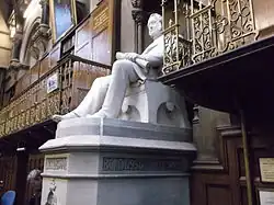 The architect was Archibald Matthias Dunn, whose father, mining engineer and Mines Inspector Matthias Dunn, had been present at the institute's inaugural meeting. It was built at the height of the English Gothic Revival and shows a mixture of gothic and Tyneside Classical themes. The Library has high windows and a sky lit barrel-vaulted ceiling - the highest point 39 ft above the floor - with stained glass windows by Cooke of London. It includes a monumental statue of Nicholas Wood mounted on a throne in the setting of an iconstasis. There are other works of art including marble busts of John Buddle and Thomas Forster, the institute's second president[4] and a carving of the River God Tyne including the Institute motto Moneo et munio - I advise and I protect. The original lecture theatre was replaced by the current one in 1902 designed by local architects Cackett and Burns Dick, and modelled on that at the Royal Institution in London. It features a steep rake of seating constructed from Cuban mahogany and the walls display portraits of all the institute's Presidents since 1852.