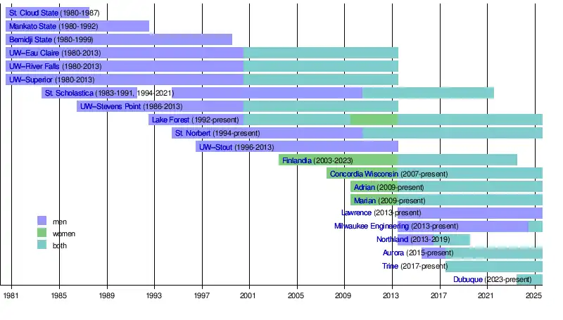 In the summer of 2012, the five schools in the University of Wisconsin System announced that they would leave the conference to begin playing hockey in their all-sports conference, the Wisconsin Intercollegiate Athletic Conference.[2][3] The move would have left only two men's teams in the NCHA, leading St. Norbert and St. Scholastica to join the Midwest Collegiate Hockey Association (MCHA).[4] In April 2013, the NCHA and MCHA announced a merger, where the NCHA would absorb the MCHA's teams (of the MCHA's 10 schools, all 7 who also sponsored women's hockey played in the NCHA).[5] The men's and women's sides will retain separate administrative structures, as well as their automatic bids to the NCAA Tournament.[6]
