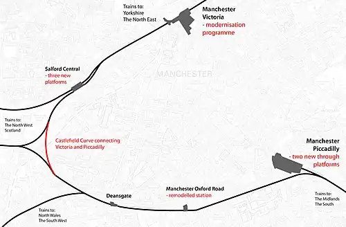 Services from Liverpool to Leeds and beyond were diverted from the Liverpool to Manchester line southern route, via Warrington Central and Manchester Piccadilly, to the more direct electrified Liverpool to Manchester northern route, via Newton-le-Willows and Manchester Victoria; this provides a fast route to and through Manchester. The original proposals included an additional two through platforms at Manchester Piccadilly station which would have allowed a further four trains per hour through the Castlefield corridor, however this was officially cancelled in May 2023.[5]