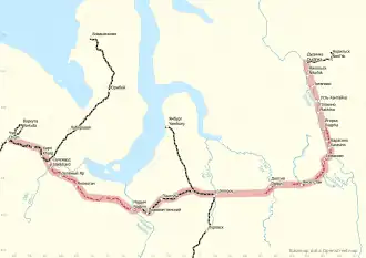 The Northern Latitudinal Railway (NLR; Северный широтный ход) is a Russian railway line previously under construction (construction is currently suspended) in the Yamalo-Nenets Autonomous District. It is 707 kilometres long, along the Obskaya - Salekhard - Nadym - Novy Urengoy - Korotchaevo route, which should link the western and eastern parts of the autonomous region, linking the Northern Railway in the east with Sverdlovsk Oblast. The project is run jointly by the Government of Russia, the governments of the Yamal-Nenets Autonomous District, PJSC Gazprom, JSC Russian Railways, and Development Corporation JSC. The construction coordinator of the railway is the Federal Agency for Rail Transport (Roszheldor).[1] Construction of the NLR is planned to be carried out from 2018 to 2022.[2] The estimated volume of traffic at completion is 24 million tons (mainly gas condensate and oil cargo).[3] Initially, the highway was supposed to be laid by 2015, but due to the lack of a budget solution, the project completion dates were repeatedly postponed. In February 2017, the construction was announced to be completed in 2023. The project cost was estimated at 239 billion Rubles.[4] In November 2022, it was announced that the government had suspended this project in favor of expanding rail eastward.[5]