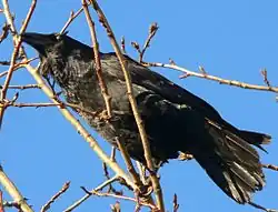 The findings indicate that based on mitochondrial DNA, common ravens from the rest of North America are more closely related to those in Europe and Asia, than to those in the California clade, and that common ravens in the California clade are more closely related to the Chihuahuan raven (C. cryptoleucus) than to those in the Holarctic clade.[23][16] Ravens in the Holarctic clade are more closely related to the pied crow (C. albus) than they are to the California clade.[24] Thus, the common raven species as traditionally delimited is considered to be paraphyletic.[24]