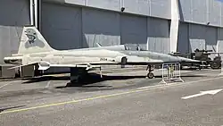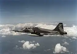 After winning the International Fighter Aircraft Competition, a program aimed at providing effective low-cost fighters to American allies, in 1972 Northrop introduced the second-generation F-5E Tiger II. This upgrade included more powerful engines, larger fuel capacity, greater wing area and improved leading-edge extensions for better turn rates, optional air-to-air refueling, and improved avionics, including air-to-air radar. Primarily used by American allies, it remains in US service to support training exercises. It has served in a wide array of roles, being able to perform both air and ground attack duties; the type was used extensively in the Vietnam War.[2] A total of 1,400 Tiger IIs were built before production ended in 1987. More than 3,800 F-5s and the closely related T-38 advanced trainer aircraft were produced in Hawthorne, California.[3] The F-5N/F variants are in service with the United States Navy and United States Marine Corps as adversary trainers.[4] Over 400 aircraft were in service as of 2021.[5][N 1]