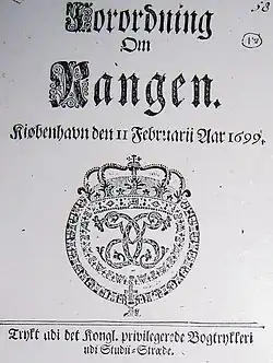 - ^ Older Danish: Grevernis Privilegier. Hafniæ die 25. Maji Anno 1671. Original print stored in the Danish State Archives, the Library, Decrees (Forordninger), Posters (Placater), etc. 1613–1814. Volume VI, 1671–1675.